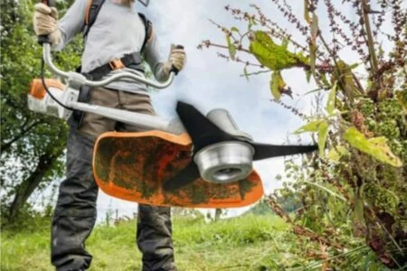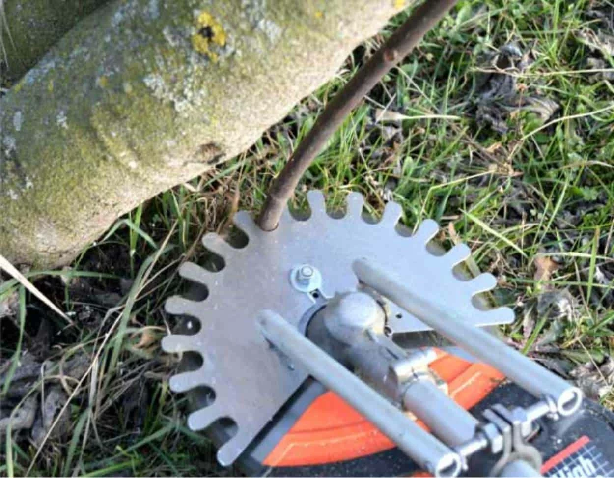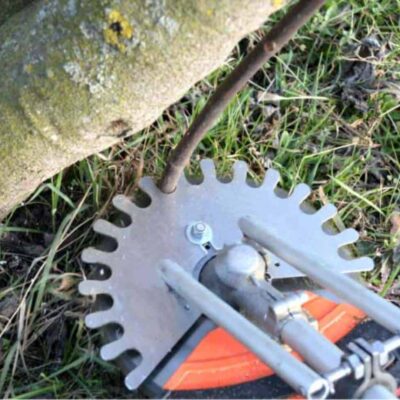 Per tagliare i polloni alla base degli alberi si può usare qualsiasi decespugliatore a lama, la particolarità di questo attrezzo specifico è di avere integrato un salvacorteccia comodissimo.