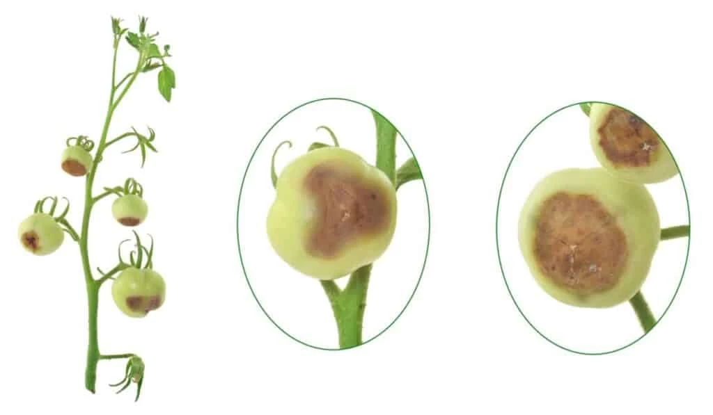 Sul pomodoro ancora acerbo si notano delle macchie circolari, di colore inizialmente verde, che si scuriscono fino a necrotizzare man mano che le condizioni peggiorano. La zona colpita può arrivare a presentare una depressione, come fosse lesionata, come colore si presenta in un opaco grigio nero. Il punto in cui si verifica questa deformazione è quasi sempre la punta del pomodoro.