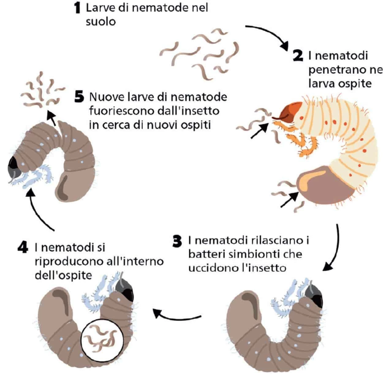 I nematodi attaccano le larve di insetti bersaglio, entrando nel loro organismo dove rilasciano dei batteri simbionti in grado di uccidere l’insetto. La larva colpita muore e farà da nutrimento ai nematodi, che si riproducono al suo interno, formando una nuova generazione che andrà poi a cercare nuove prede.