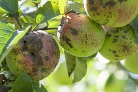 Le malattie fungine più comuni del melo sono la ticchiolatura e l’oidio. La prima si manifesta con tante piccole macchie scure tondeggianti su foglie e frutti, la seconda con chiazze biancastre polverose. In agricoltura biologica si previene tutto ciò arieggiando le chiome con le giuste potature e scegliendo in partenza varietà resistenti o tolleranti.