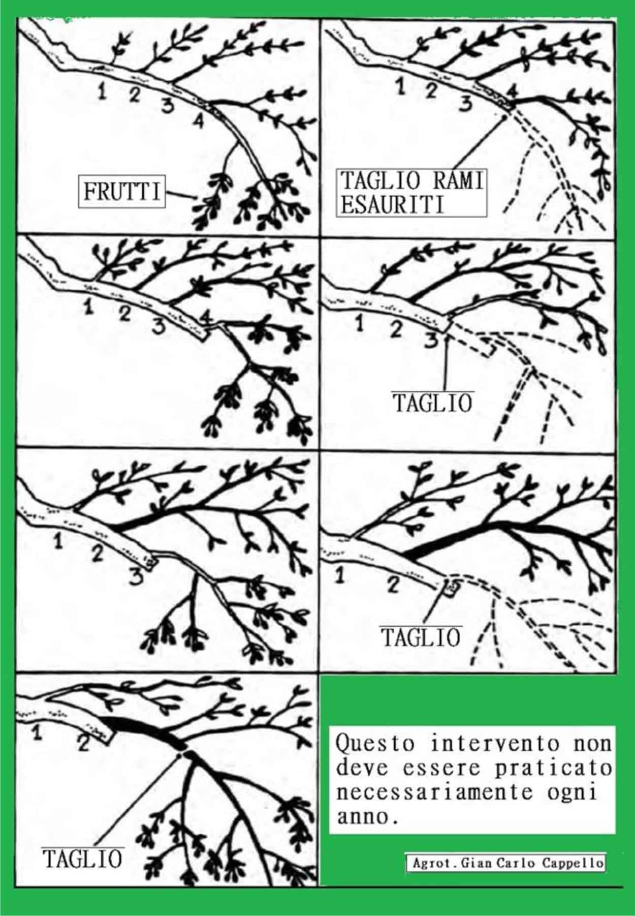 In condizioni naturalizzate è sufficiente l’asportazione totale delle ramificazioni basali e interne, con una cernita non invasiva delle ramificazioni esterne la cui selezione è assai facile in quanto quelle uscenti dalle produzioni degli anni precedenti appaiono quasi prive di foglie, soprattutto apicali (vedi illustrazione).