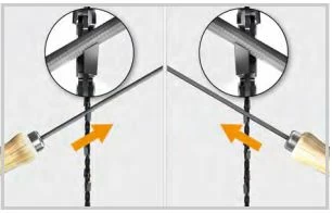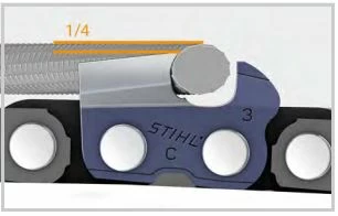 - Non premete la lima in fondo alla sede del dente, mantenetela leggermente sollevata così da far sporgere circa ¼ del suo diametro al di sopra del dente: la parte tagliente che lavora è quella più esterna alla maglia, non quella più interna!