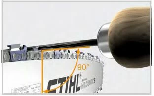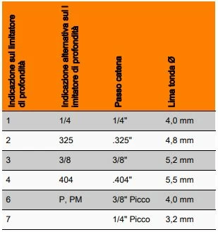 Per capire quale sia la lima necessaria bisogna fare riferimento al passo della catena montata, che si dovrebbe conoscere all’acquisto della motosega ma che è comunque stampato sulle maglie della stessa (sul limitatore di profondità o sulla pinna che scorre nella barra). Ad esempio STIHL per agevolare la scelta riporta sul limitatore di profondità un numero, da 1 a 5, e ad ognuno è associato un passo catena e quindi una lima.