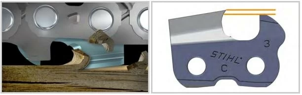 La nostra motosega lavora mettendo in movimento una catena dentata, che scorre sulle guide di una barra e taglia asportando legno, secondo il principio di una pialla in miniatura. Per limitare la profondità del taglio ogni dente ha davanti a se una pinna non affilata, detta limitatore di profondità.