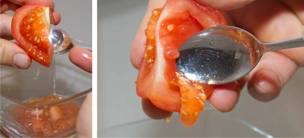 Con un cucchiaio togliamo la parte gelatinosa assieme ai semi, separandola dalla parte spugnosa. La gelatina è composta da una sostanza anti-germinante, che impedisce al seme stesso di germinare mentre si trova ancora all’interno del pomodoro.