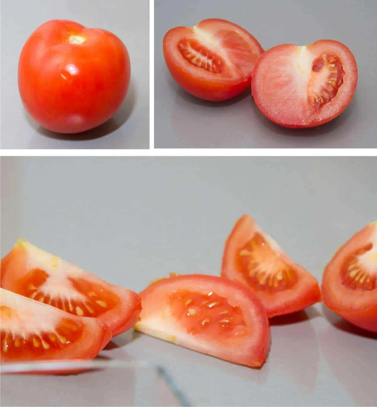 Dopo aver raccolto il frutto giusto procediamo tagliando in due il pomodoro. Il suo interno è composto da una parte molliccia e gelatinosa, dove sono incorporati i semi, e da una parte più solida e spugnosa.