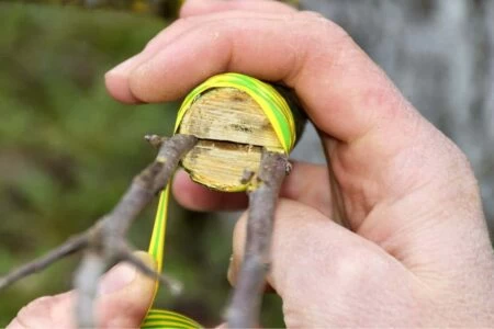 A questo punto dobbiamo infilare le marze nel portinnesto, possiamo eventualmente aiutarci con un coltello o una spatola per distanziare la corteccia in modo da riuscire a far penetrare l’estremità della marza. I tessuti dei due bionti devono essere a stretto contatto, con la parte scortecciata della marza aderente alla zona di cambio del portinnesto. Quando questo si verifica leghiamo stretto con rafia o nastro, poi possiamo decidere di impiegare il mastice.
