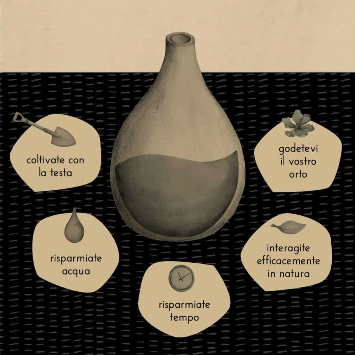 - Risparmio di tempo. Anche nei periodi più caldi non serve dare acqua tutti i giorni, l’anfora ci garantisce una certa autonomia (variabile a seconda di clima e dimensioni).