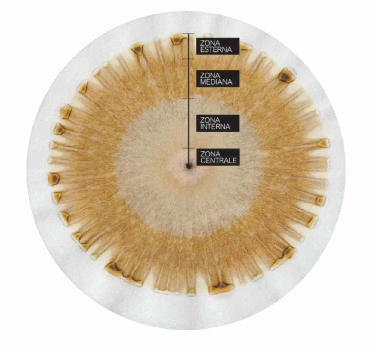 - Dalla zona centrale possiamo dedurre lo stato di ossigenazione del suolo; tinte scure nelle zone centrale e mediana sono indice di un suolo con poco ossigeno e quindi compattato, mentre in suoli con una migliore struttura i colori risulteranno più chiari e brillanti.