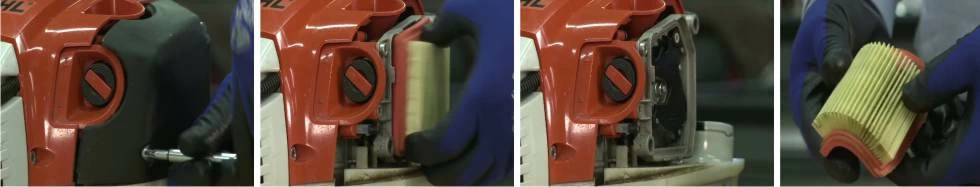 Per la pulizia del filtro dell’aria è necessario aprire il coperchio che protegge il filtro e pulire il filtro stesso con un compressore oppure con un pennellino imbevuto di un prodotto sgrassante. Questo dovrebbe essere fatto possibilmente dopo ogni utilizzo del decespugliatore. I filtri di carta non devono essere puliti con un compressore, poiché l’aria ad alta pressione li danneggerebbe, mentre i filtri già lesionati o macchiati devono essere immediatamente sostituiti. La pulizia del filtro evita che questo provochi consumi maggiori di carburante, causando problemi durante l’accensione del motore.