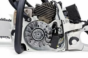 Il motore della motosega si trova esattamente a ridosso della barra, fonte di polvere e trucioli durante le fasi di lavoro. Per questo nel tempo si sono studiati forma e disposizione della ventola di raffreddamento e delle scocche in modo tale che il materiale non vada a depositarsi negli anfratti del motore o ad intasare prematuramente il filtro aria del carburatore.