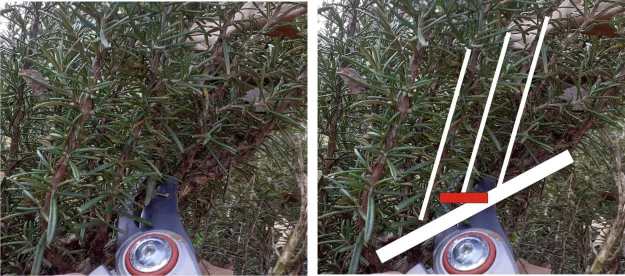 La dimensione del rosmarino si contiene con dei tagli di ritorno (tecnica base della potatura che consiste nel tornare indietro fino a una diramazione). Questo vale sia per ridurre il cespuglio in larghezza che in altezza.