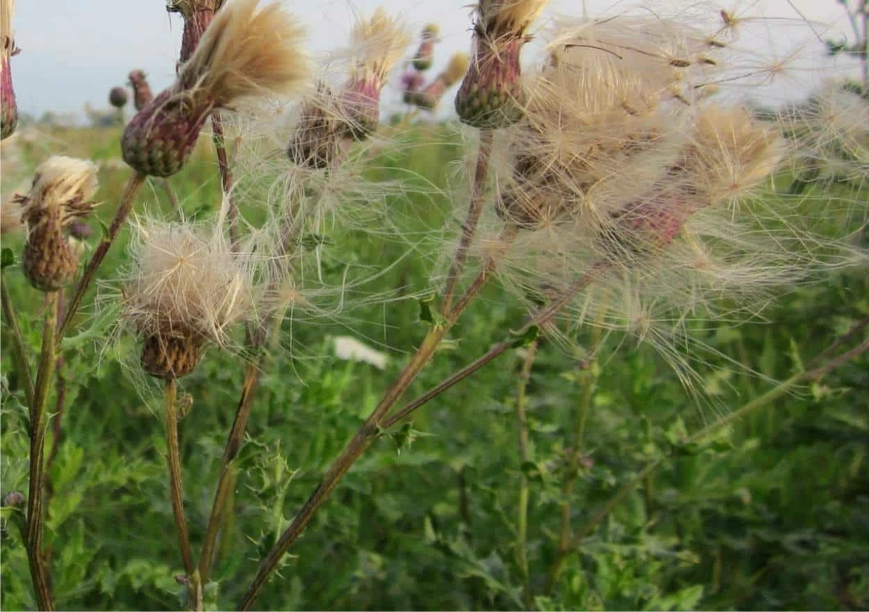 Lo stoppione (Cirsium arvense) è un’erba un po’ noiosa in quanto ha radice carnosa e forma rizomi orizzontali, e per questo la sua estirpazione non è immediata. Le foglie sono leggermente spinose, pelose nella pagina inferiore e possono dare fastidio al tatto.
