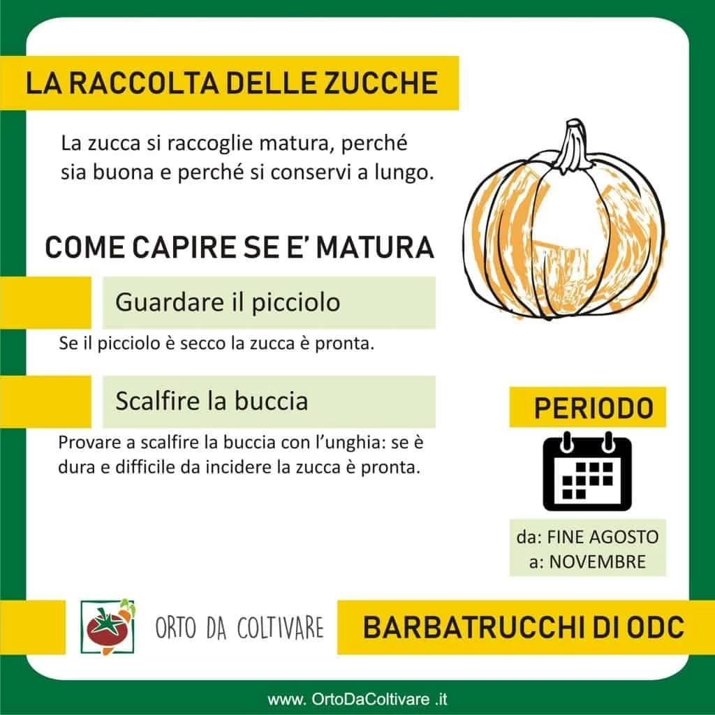 Ci sono anche delle varietà di zucche verdi che si raccolgono acerbe, proprio come si fa con le zucchine. In questo caso ovviamente non valgono le indicazioni che trovate in questo articolo: bisogna cogliere prima che il frutto diventi maturo, quando la buccia è ancora verde.