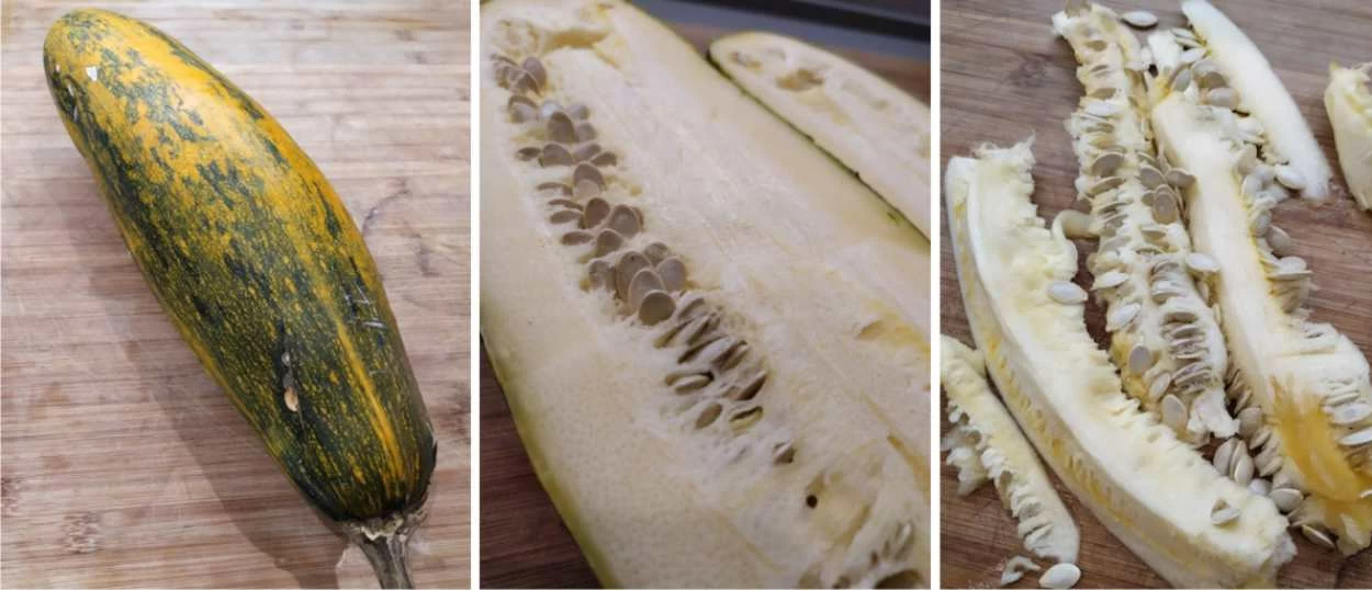 Il frutto selezionato per produrre i semi da conservare deve esser lasciato crescere sulla pianta finché va in leggera sovra maturazione, ma non deve marcire. Le zucchine, se lasciate crescere, potranno arrivare anche alla dimensione di oltre 50 centimetri, per un peso anche sopra al chilogrammo.