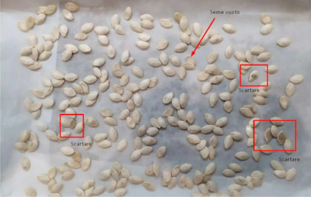 Risciacquate bene i semi e disponeteli su un piano per una prima selezione. Scartate i semi più piccoli, quelli scuri o quelli che, al tatto, sembrano vuoti.