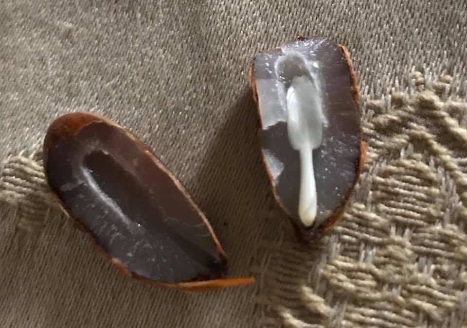 Per trovare le posate dobbiamo tagliare a metà il seme per il lungo, aiutandoci con un coltello. In genere la posata che si trova al suo interno è chiaramente visibile, di un bel color bianco. Non sarà difficile capire se abbiamo trovato una forchetta, un cucchiaio oppure un coltello.