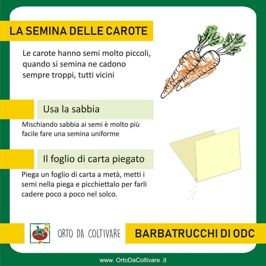 Quello di carota è un semino molto piccolo, basta pensare che in un grammo di semente ce ne possono essere anche 800, per questo deve essere posto a una profondità molto bassa, meno di mezzo centimetro. Per via delle dimensioni è scomodo prendere i semini uno per uno, la semina si effettua più comodamente tracciando i solchi e poi facendo cadere i semi aiutandosi con un foglio di carta piegato a metà. Ovviamente in questo modo le sementi cadranno molto vicine tra loro, una volta che si vedranno le piccole piantine bisognerà diradarle, in modo da ottenere la giusta distanza tra una carota e l’altra. Un altro trucco per facilitare la semina è mischiare sabbia ai semi, in questo modo la semente cade meno fitta e il dirado sarà minore.