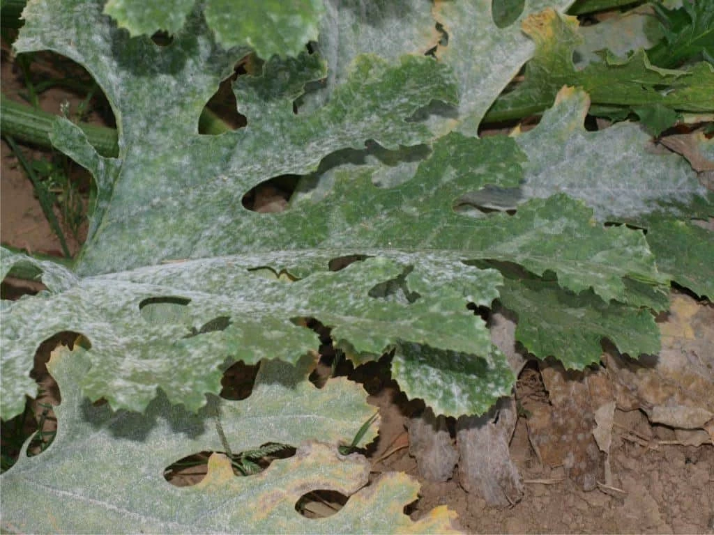 L’oidio, chiamato anche “mal bianco”, è una patologia fungina che provoca delle efflorescenze bianco-grigie polverose sulle foglie e sugli steli delle zucchine, arrivando a colpire anche i frutti. In estate, soprattutto nelle zone afose con poca ventilazione, questa malattia è diffusissima negli orti e colpisce anche le zucche e le altre cucurbitacee. Alcune varietà di zucchine mostrano di loro natura striature estese bianco argentee sul fogliame, ma queste non devono essere confuse con l’oidio, che si mostra irregolare nell’aspetto e polveroso come consistenza.