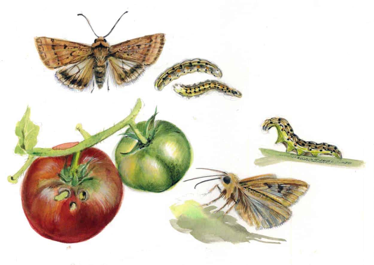 Le uova schiudono dando vita alle larve, e sono proprio queste che arrecano i danni alle piante di pomodoro, inizialmente alle foglie e ai fiori, ma poi, con la seconda generazione soprattutto ai frutti, che colpiscono a qualsiasi stadio di maturazione si trovino, penetrando soprattutto nei punti vicini al peduncolo. Al termine della vita larvale, gli insetti cadono a terra per incrisalidarsi e diventare infine adulti. Nell’arco dell’anno si susseguono fino a quattro generazioni di nottua e lo svernamento avviene nel terreno allo stadio di crisalide.