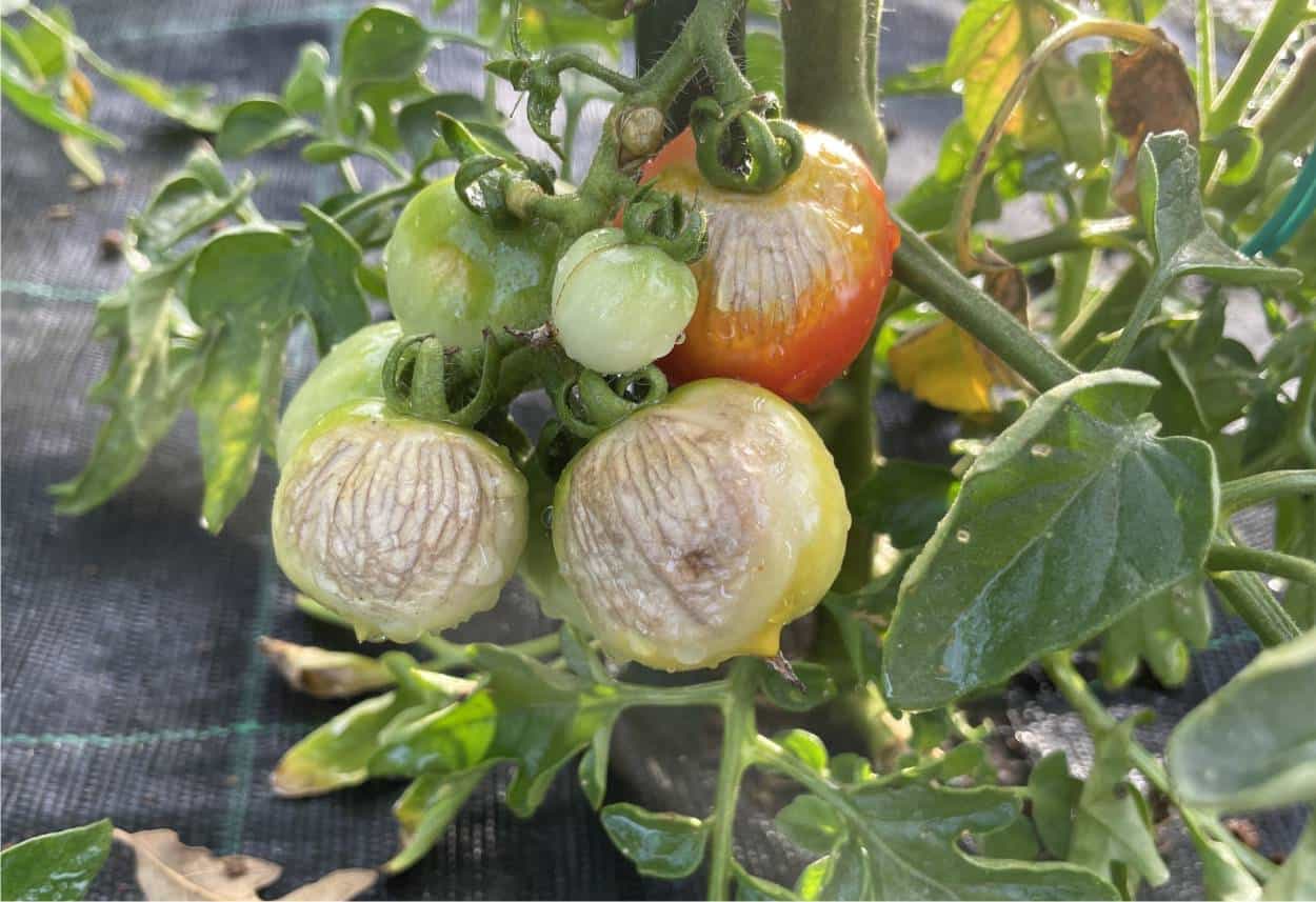 Il pomodoro è soggetto a varie malattie, ma anche ad altre fisiopatie, come il già citato marciume apicale (mancanza di calcio) e come le spaccature dei frutti (eccessi, carenze o squilibri di acqua). La scottatura si distingue perché la chiazza bianca è dove batte il sole e la buccia del frutto non si presenta spaccata.