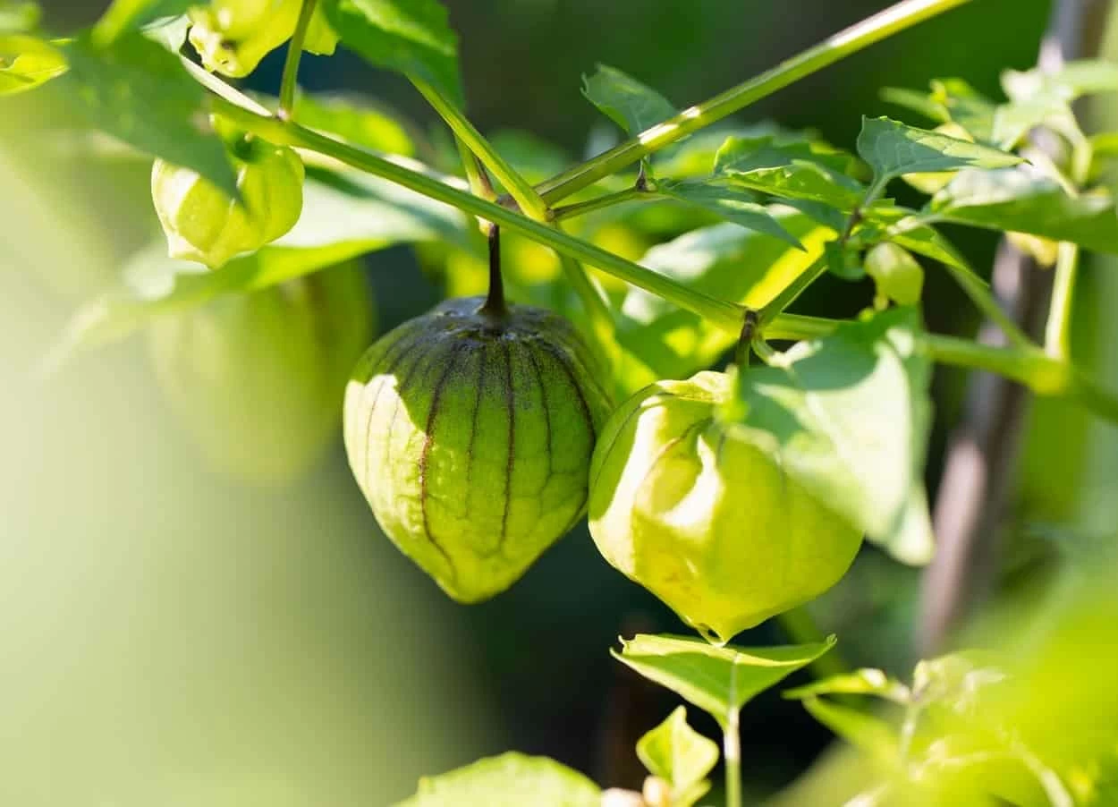 I frutti del tomatillo sono come piccoli pomodori, di colore verde o viola, e hanno un rivestimento simile a quello degli alchechengi.