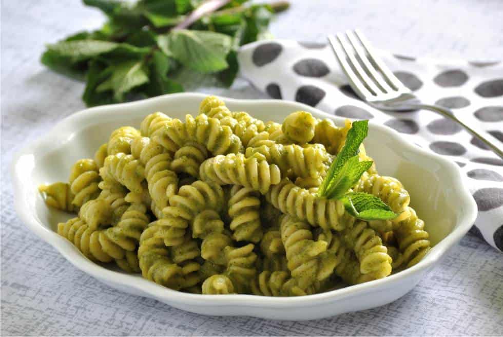 Appena la pasta sarà cotta, scolatela e conditela con il pesto di zucchine e menta. Servite questo primo piatto vegetariano ben caldo.