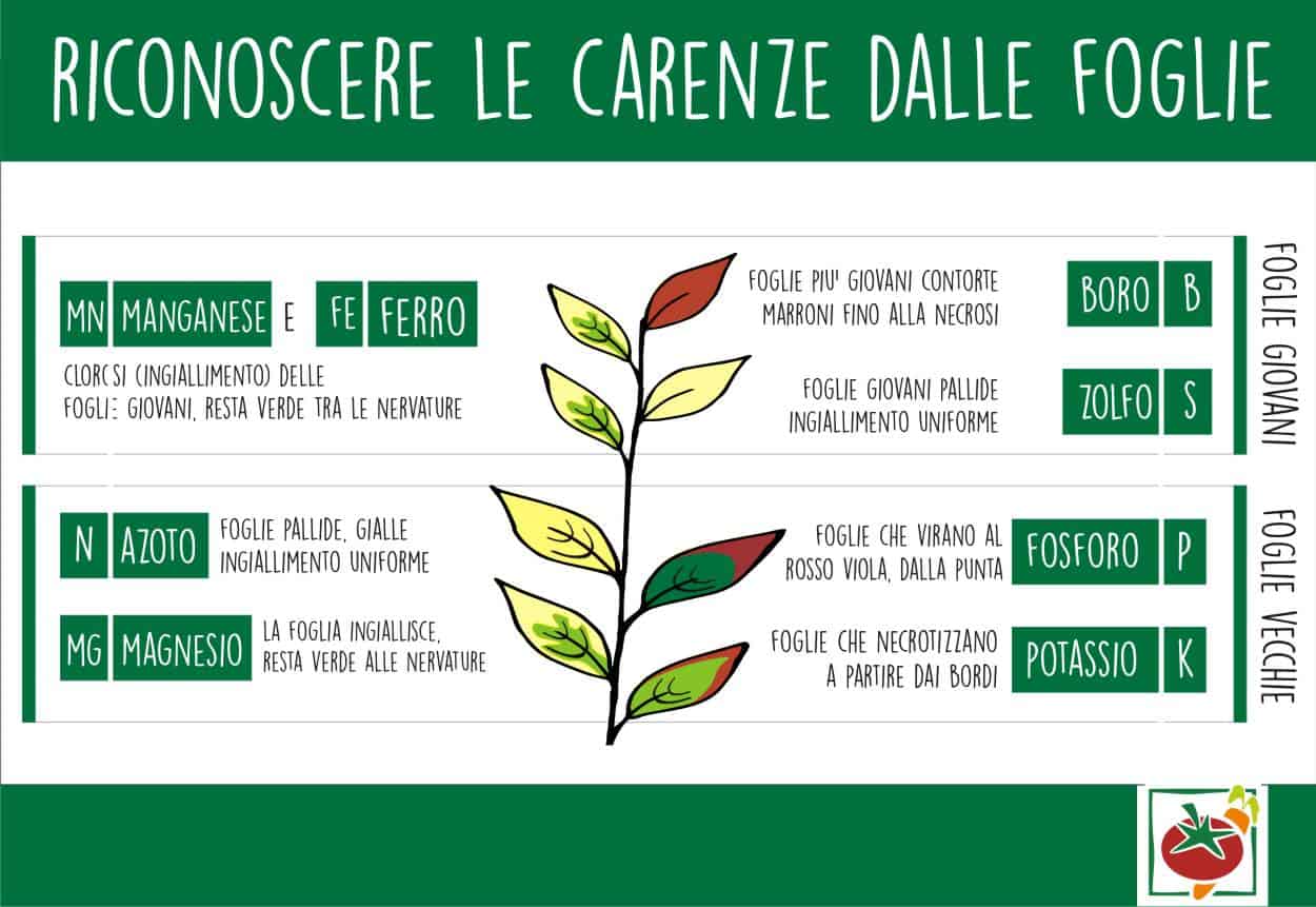 Molto spesso i sintomi di carenza si evidenziano sulle foglie: a seconda delle loro carenze nutrizionali, le foglie delle piante cambiano aspetto e colore. Abbiamo anche carenze che si manifestano sul frutto, la più celebre nell’orto è il marciume apicale dei pomodori.