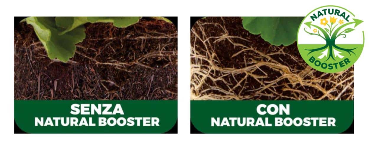 - Favorire lo sviluppo radicale. Le auxine sono dei fitormoni, molto importanti per la moltiplicazione e lo sviluppo delle radici. Sono elementi presenti in natura, purtroppo sono delicate e tendono a degradarsi velocemente. Con l’azione protettiva di Natural Booster si può ridurre del 60% la velocità di degradazione di questi ormoni delle piante, il risultato è avere radici più lunghe e più numerose.