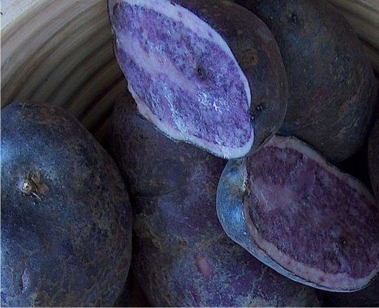 Patate Vitellotte: varietà viola più conosciuta e presente da tempo sul mercato, si tratta di patate di tra il blu e il viola dal colore molto marcato, con la buccia spessa e la polpa farinosa.